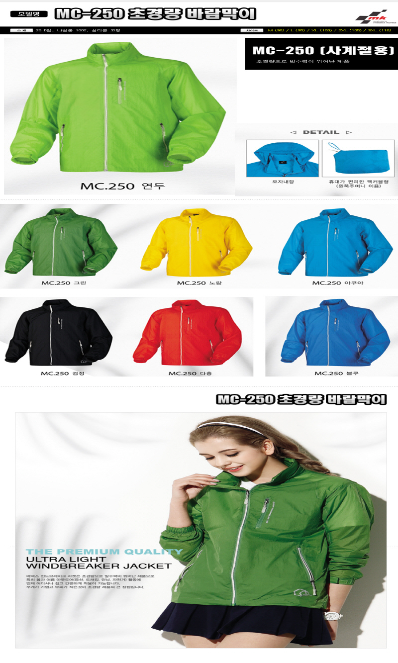 •Size : M, L, XL, 2XL, 3XL •소재 : 나일론 100%, 20D립, 실리톤 코팅 ※단가변동 있을 수 있습니다. 제품 색상은 인쇄된 것이므로 실제 제품과 다소 차이가 있을 수 있습니다. MC-250