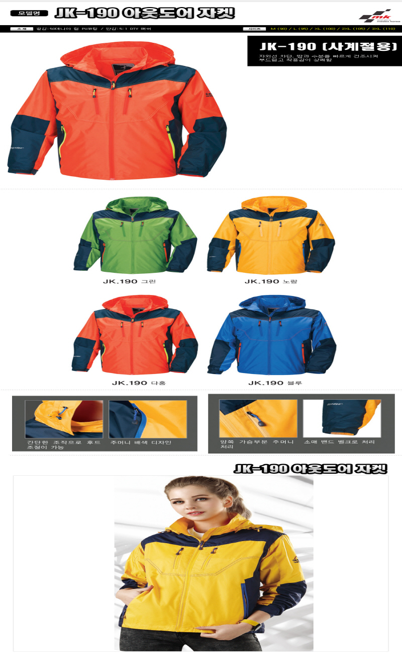 •Size : M, L, XL, 2XL, 3XL •소재 : 50데니아 립PU코팅/안감:5:1 DTY 매쉬 ※단가변동 있을 수 있습니다. 제품 색상은 인쇄된 것이므로 실제 제품과 다소 차이가 있을 수 있습니다. MC-190