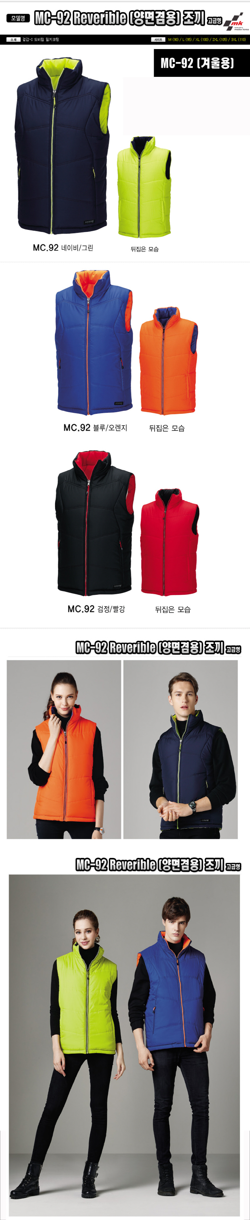 MC-92 •Size : M, L, XL, 2XL, 3XL •소재 : 겉감-S도비립 밀키코팅 •특징 : 에어로솜 8온스를 사용하여 보온성이 매우 뛰어남 양면조끼이므로 운동시 팀을 나눠 착용할 수 있음 ※단가변동 있을 수 있습니다. 제품 색상은 인쇄된 것이므로 실제 제품과 다소 차이가 있을 수 있습니다.