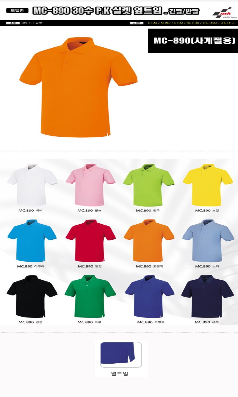 •Size : S, M, L, XL, 2XL, 3XL •소재 : 30수 P.K 실켓 ※단가변동 있을 수 있습니다. 제품 색상은 인쇄된 것이므로 실제 제품과 다소 차이가 있을 수 있습니다. MC-890